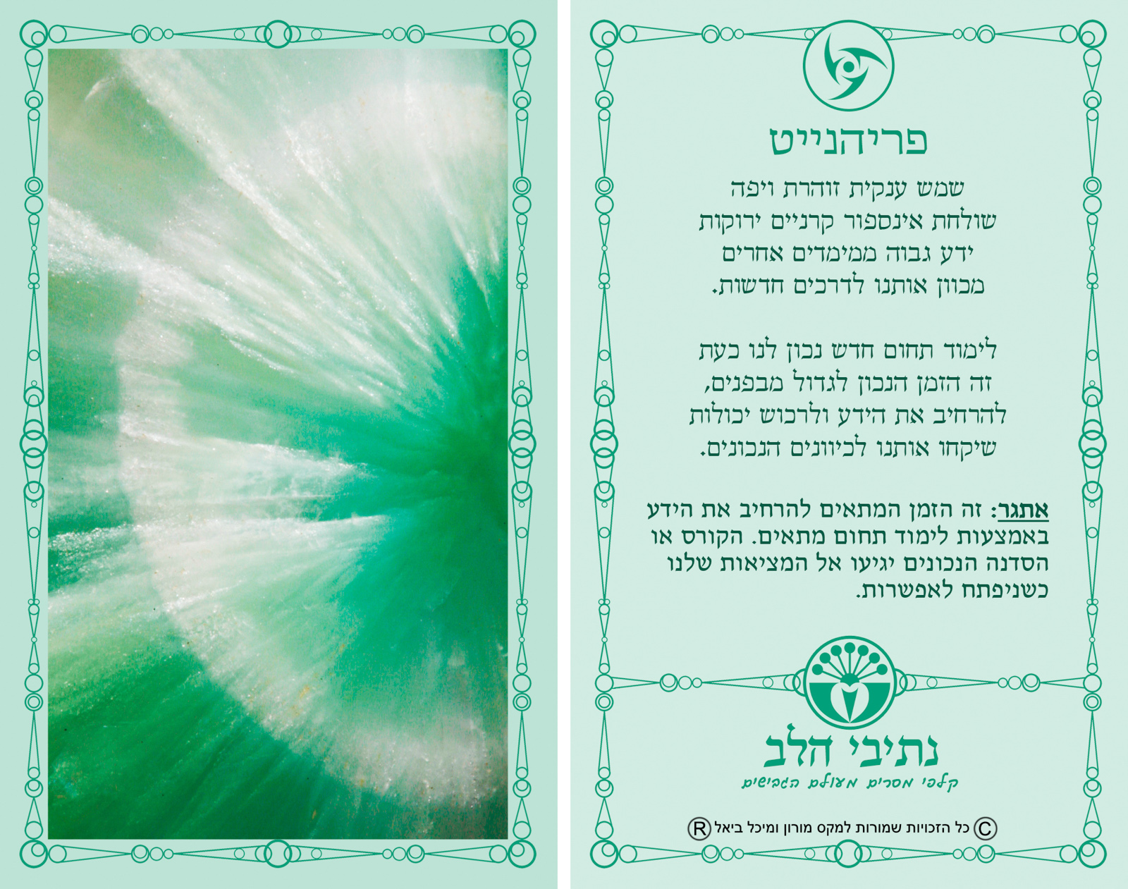 היבט רוחני: עוזרת ליצור קשר עם יישויות שנמצאות במימדים אחרים. מצוינת לפענוח והבנת מסרים שמגיעים דרך חלומות. לצורך עבודה עם חלומות טוב לשים מושבה של פריהנייט ליד המיטה. משמשת מעין טרנספורמטור המאפשר לאנרגיות גבוהות לעבור התמרה ולהגיע למציאות הפיזית בצורה בה אפשרי יהיה לבני אנוש להכיל אותן. מתאימה לתהליכים אנרגטיים בקנה-מידה נרחב, כמו העברת אנרגיה לשטח גדול כמו שכונה או עיר. עבודתה הרוחנית קשורה לזו של האפופילייט והן מרבות לשתף פעולה בהתגבשותן בטבע.